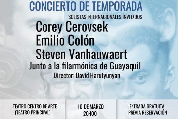 Continue ReadingTres músicos internacionales arribarán a la ciudad de Guayaquil, para brindar un concierto gratuito de música clásica. Contaremos con la visita de Emilio Colón en el chelo (Puerto Rico), Corey Cerovsek en violín (Canadá) y Steven Vanhauwaert en piano (Bélgica), quienes brindarán un Concierto de Temporada bajo la dirección del maestro David Harutyunyan junto […]