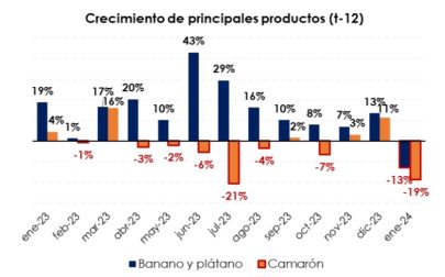 En el mes de enero, dos de los cinco principales productos de exportación registraron reducción. Las exportaciones de camarón han caído en 8 de los últimos 12 meses, mientras que las exportaciones de banano registran su primera caída en 13 meses.