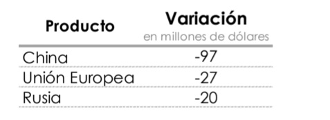 Los principales mercados que mayor reducción en exportaciones registran entre enero y noviembre de 2023 en comparación con el mismo periodo de 2022 son: